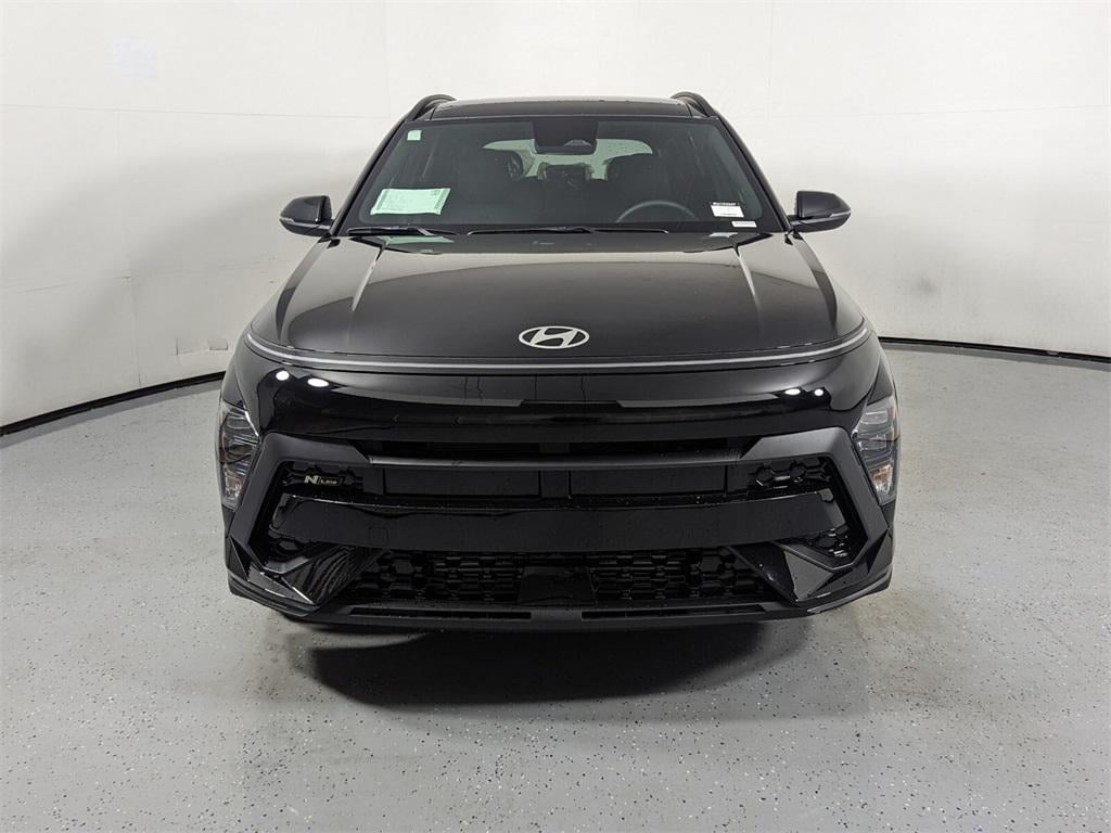 Features: Option Group 01, Kona N Line, 4D Sport Utility, I4, 8-Speed Automatic, FWD, Abyss Black Pearl, Black Artificial Leather, 3.510 Axle Ratio, 4-Wheel Disc Brakes, 8 Speakers, ABS brakes, Air Conditioning, Alloy wheels, AM/FM radio: SiriusXM, Apple CarPlay & Android Auto, Auto High-beam Headlights, Auto-dimming Rear-View mirror, Automatic temperature control, Brake assist, Bumpers: body-color, Cargo Blocks, Cargo Net, Cargo Tray, Carpeted Floor Mats, Column-Mounted Shift-By-Wire, Delay-off headlights, Driver door bin, Driver vanity mirror, Dual front impact airbags, Dual front side impact airbags, Electronic Stability Control, Emergency communication system: Bluelink+, Exterior Parking Camera Rear, First Aid Kit, Front anti-roll bar, Front Bucket Seats, Front Center Armrest, Front dual zone A/C, Front reading lights, Front wheel independent suspension, Fully automatic headlights, Heated door mirrors, Heated front seats, Heated Front Sport Bucket Seats, Illuminated entry, Leather Shift Knob, Leather steering wheel, Low tire pressure warning, Mud Guards, N-Line Alcantara Sport Combination Seat Trim, Navigation System, Occupant sensing airbag, Outside temperature display, Overhead airbag, Panic alarm, Passenger door bin, Passenger vanity mirror, Power door mirrors, Power driver seat, Power moonroof, Power steering, Power windows, Radio: AM/FM/HD Radio/SiriusXM Audio System, Rear seat center armrest, Rear window defroster, Rear window wiper, Remote keyless entry, Security system, Speed control, Speed-sensing steering, Split folding rear seat, Spoiler, Steering wheel mounted audio controls, Tachometer, Telescoping steering wheel, Tilt steering wheel, Traction control, Trip computer, Turn signal indicator mirrors, Variably intermittent wipers, Wheel Locks, and Wheels: 19" x 7.5J Metallic Alloy.