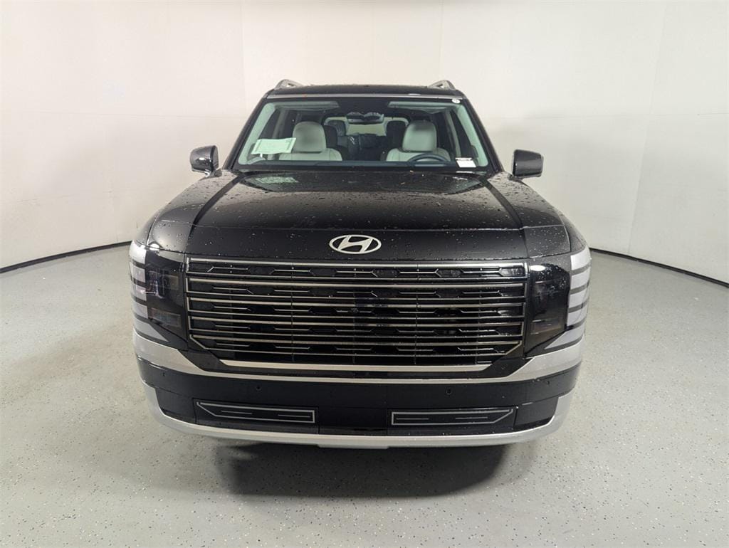 Features: Option Group 01, Palisade Calligraphy, 4D Sport Utility, V6, 8-Speed Automatic, FWD, Abyss Black Pearl, Gray/Navy Leather, 14 Speakers, 3rd row seats: split-bench, 4-Wheel Disc Brakes, ABS brakes, Air Conditioning, Alloy wheels, AM/FM radio: SiriusXM, Apple CarPlay & Android Auto, Audio memory, Auto High-beam Headlights, Auto-dimming door mirrors, Auto-dimming Rear-View mirror, Auto-leveling suspension, Automatic temperature control, Brake assist, Bumpers: body-color, Cargo Net, Cargo Tray, Carpeted Floor Mats, Compass, Delay-off headlights, Driver door bin, Driver vanity mirror, Dual front impact airbags, Dual front side impact airbags, Electronic Stability Control, Emergency communication system: Bluelink+, Exterior Parking Camera Rear, First Aid Kit, Four wheel independent suspension, Front anti-roll bar, Front Bucket Seats, Front Center Armrest, Front dual zone A/C, Front reading lights, Fully automatic headlights, Garage door transmitter: HomeLink, Genuine wood console insert, Genuine wood dashboard insert, Heads-Up Display, Heated & Ventilated Front Bucket Seats, Heated door mirrors, Heated front seats, Heated rear seats, Heated steering wheel, HVAC memory, Illuminated entry, Knee airbag, Leather steering wheel, Low tire pressure warning, Memory seat, Navigation System, Occupant sensing airbag, Outside temperature display, Overhead airbag, Overhead console, Panic alarm, Passenger door bin, Passenger vanity mirror, Power door mirrors, Power driver seat, Power Liftgate, Power moonroof, Power passenger seat, Power steering, Power windows, Premium Nappa Leather Seat Trim, Radio data system, Radio: Infotainment Navigation System, Rain sensing wipers, Rear air conditioning, Rear anti-roll bar, Rear audio controls, Rear reading lights, Rear side impact airbag, Rear window defroster, Rear window wiper, Reclining 3rd row seat, Remote keyless entry, Roadside Assistance Kit, Security system, Speed control, Split folding rear seat, Spoiler, Steering wheel mounted audio controls, Tachometer, Telescoping steering wheel, Tilt steering wheel, Traction control, Trip computer, Turn signal indicator mirrors, Variably intermittent wipers, Ventilated front seats, Ventilated rear seats, and Wheels: 21" x 8.5J Alloy.