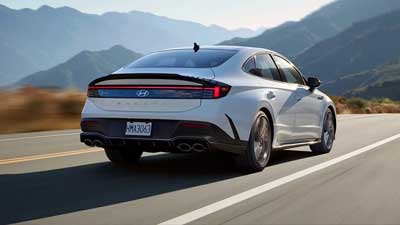 The enthusiast-oriented Sonata N Line sedan is powered by a 2.5-liter turbocharged inline four-cylinder engine using GDI and MPI technologies. The result is 290 horses and 311 lb-ft of torque. The power is delivered to the front wheels by an N-tuned 8-speed wet dual clutch automatic transmission. A sport-tuned MacPherson Strut suspension in front is matched to a similarly-tuned Multilink rear suspension for optimal traction and handling. The package finishes itself off with twin-tip dual exhausts.
