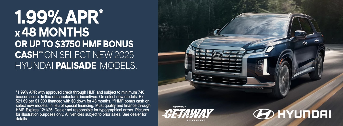 Dealer not responsible for typographical errors. Pictures are for illustration purposes only. All vehicles subject to prior sales. See dealer for details. MSRP may not be price at which vehicle is sold in trade area. New car prices include applicable manufacturer incentives in lieu of special financing. Plus tax, title, tag, $199 doc processing & $899 dealer fees. For In-Transit Inventory, any date of arrival is estimated. The actual date of delivery may vary due to circumstances beyond Hyundai and the dealer’s control. Contact dealer for additional information. New vehicle MPG’s are EPA’s estimated highway MPG’s. New vehicle MPGe/EPA Range Rating are based on EPA Range Rating. See dealer for copy of limited warranty. Used car prices plus tax, title, tag, $199 doc processing & $899 dealer fees. Used car MPG claims are based on EPA estimated city and highway ratings when vehicle was new. Consumers actual mileage will vary. The value of used vehicles varies with mileage, usage and condition. Book values should be considered estimates only. Price includes incentive from HMF. May require financing.
