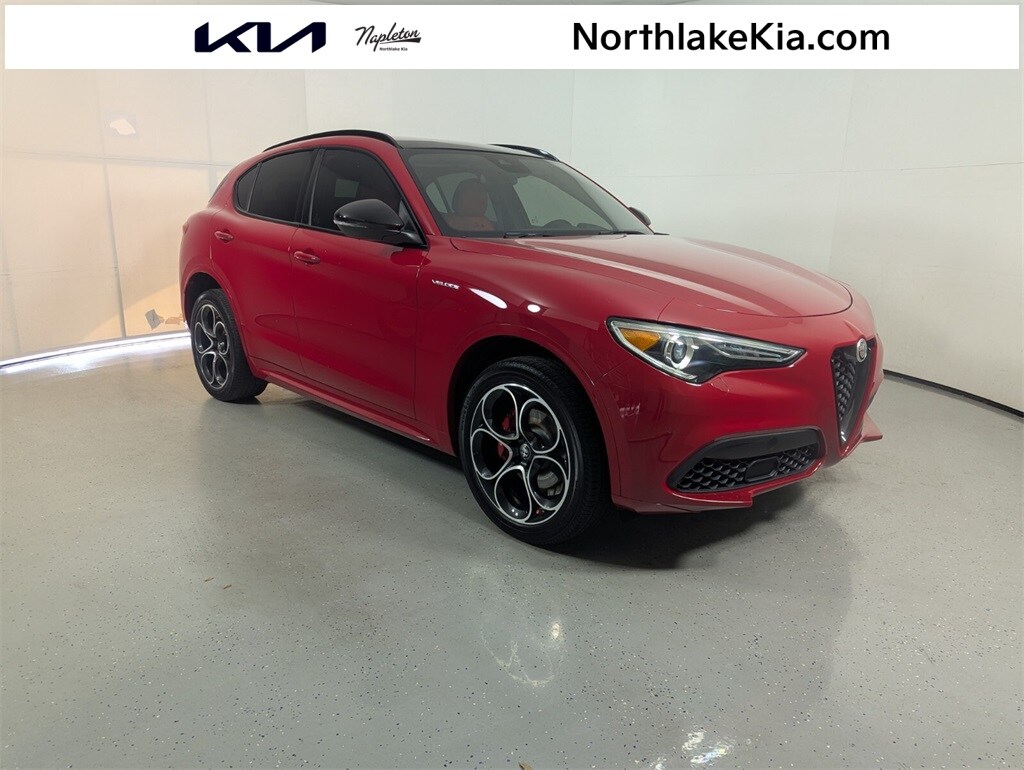 2022 Alfa Romeo Stelvio Veloce Beautifully finished in Alfa Rosso with Black Leather interior. I4 4D Sport Utility AWD 8-Speed Automatic 115V Auxiliary Power Outlet, 3.73 Axle Ratio, 4-Wheel Disc Brakes, 8 Speakers, ABS brakes, Air Conditioning, Alloy wheels, Aluminum Interior Trim, Aluminum Steering Column Mounted Paddle Shifters, AM/FM radio: SiriusXM, Apple CarPlay/Android Auto, Auto High-beam Headlights, Auto-dimming door mirrors, Auto-dimming Rear-View mirror, Automatic temperature control, Body Color Appearance Kit, Brake assist, Bumpers: body-color, Compass, Dark Miron V Scudetto Grille, Delay-off headlights, Driver door bin, Driver vanity mirror, Dual front impact airbags, Dual front side impact airbags, Electronic Stability Control, Emergency communication system: SiriusXM Guardian - included trial, Four wheel independent suspension, Front anti-roll bar, Front Bucket Seats, Front Center Armrest, Front dual zone A/C, Front reading lights, Fully automatic headlights, Garage door transmitter, Genuine wood console insert, Genuine wood dashboard insert, Genuine wood door panel insert, Gloss Black Window Surround Moldings, Gloss Red Calipers w/White Script, harman/kardon Premium Audio, Headlight cleaning, Heated door mirrors, Heated front seats, Heated rear seats, Heated steering wheel, High intensity discharge headlights: Bi-Xenon, Illuminated entry, Knee airbag, Leather Dash & Upper Doors, Leather Seats, Leather Shift Knob, Leather steering wheel, Limited Slip Differential Rear Axle, Low tire pressure warning, Memory seat, Navigation System, Occupant sensing airbag, Outside temperature display, Overhead airbag, Overhead console, Panic alarm, ParkView Rear Back-Up Camera, Passenger door bin, Passenger vanity mirror, Power 8-Way Adjustable Driver Seat, Power Adjust 8-Way Front Passenger Seat, Power Adjustable Bolster, Power door mirrors, Power driver seat, Power Liftgate, Power moonroof, Power passenger seat, Power steering, Power windows, Premium Interior & Sound Package, Quick Order Package 22S Veloce, Radio data system, Radio: AM/FM/HD 8.8" w/Navigation, Rain sensing wipers, Rear anti-roll bar, Rear audio controls, Rear fog lights, Rear reading lights, Rear seat center armrest, Rear window defroster, Rear window wiper, Red Seats, Remote keyless entry, Security system, Speed control, Speed-sensing steering, Speed-Sensitive Wipers, Split folding rear seat, Spoiler, Sport Leather Seats, Sport Rear Diffuser, Sport steering wheel, Steering wheel mounted audio controls, Tachometer, Telescoping steering wheel, Tilt steering wheel, Traction control, Trip computer, Turn signal indicator mirrors, Variably intermittent wipers, Wheels: 19" x 8.0" Sport 5-Hole Aluminum, Wheels: 20" x 8.5" Sport 5-Hole Aluminum. 22/28 City/Highway MPG